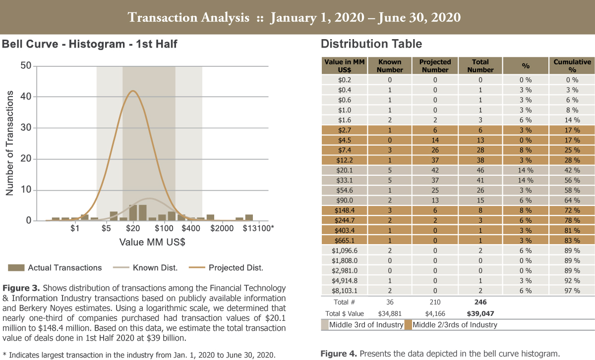 Berkery Noyes tracked 1,320 Financial Technology and Information transactions between 2018 and 1st Half 2020, of which 276 disclosed financial terms, and calculated the aggregate transaction value to be $249.01 billion. Based on known transaction values, we project values of 1,044 undisclosed transactions to be $18.73 billion, totaling $267.74 billion worth of transactions tracked over the past two and a half years.
