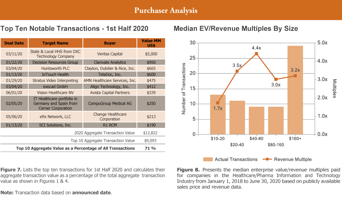 The largest strategic deal in 1st Half 2020 was Clarivate Analytics’ acquisition of Decision Resources Group, a provider of data, analytics and insights products and services used by pharma, biotech and medical technology companies, for $950 million.