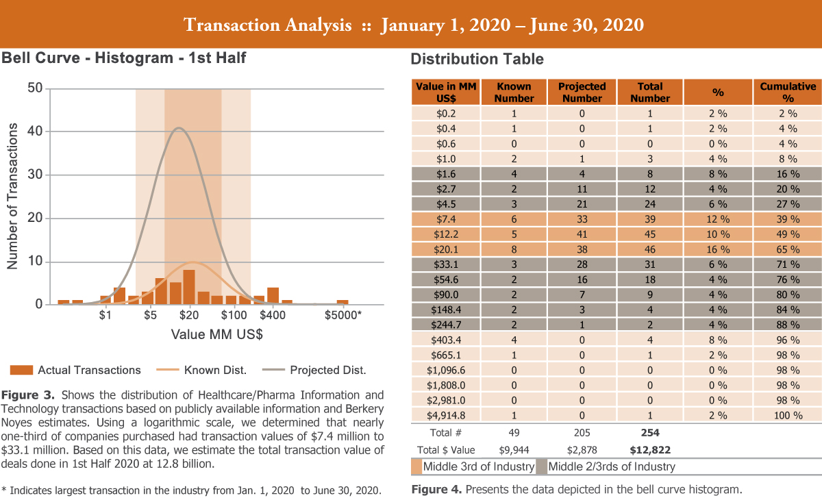 Berkery Noyes tracked 1,260 Healthcare/Pharma Information and Technology transactions between 2018 and 1st Half 2020, of which 246 disclosed financial terms, and calculated the aggregate transaction value to be $70.58 billion. Based on known transaction values, we project values of 1,014 undisclosed transactions to be $13.33 billion, totaling $83.91 billion worth of transactions tracked over the past two and a half years.