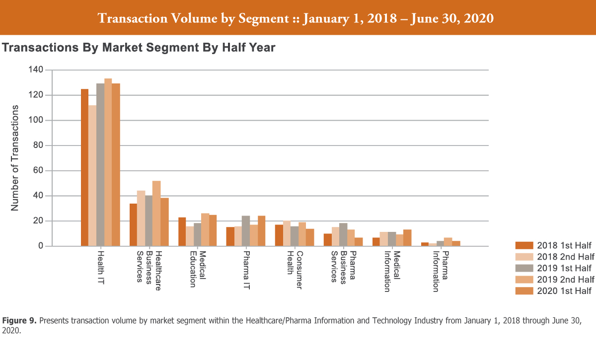 Both the Pharma IT and Medical Information segments saw increases in volume during the half year period. Pharma IT volume gained 41 percent, from 17 to 24 deals. Medical Information volume rose 44 percent, from 9 to 13 transactions.