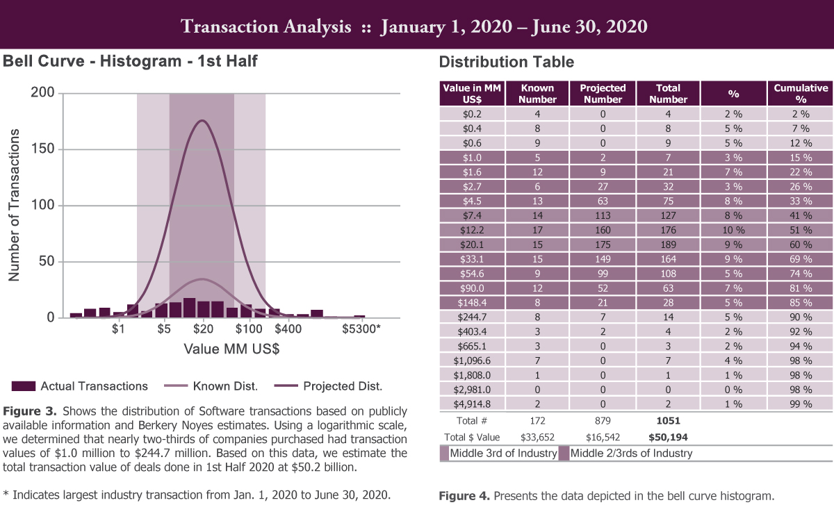 Berkery Noyes tracked 5,697 Software transactions between 2018 and 1st Half 2020, of which 1,029 disclosed financial terms, and calculated the aggregate transaction value to be $338.56 billion. Based on known transaction values, we project values of 4,668 undisclosed transactions to be $117.28 billion, totaling $455.84 billion worth of transactions tracked over the past two and a half years.