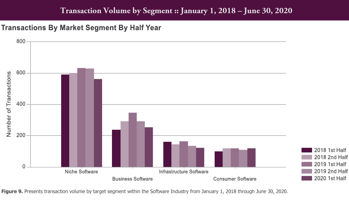 The segment with the largest rise in volume in 1st Half 2020 over 2nd Half 2019 was Consumer Software with a nine percent gain, from 109 to 119 transactions.