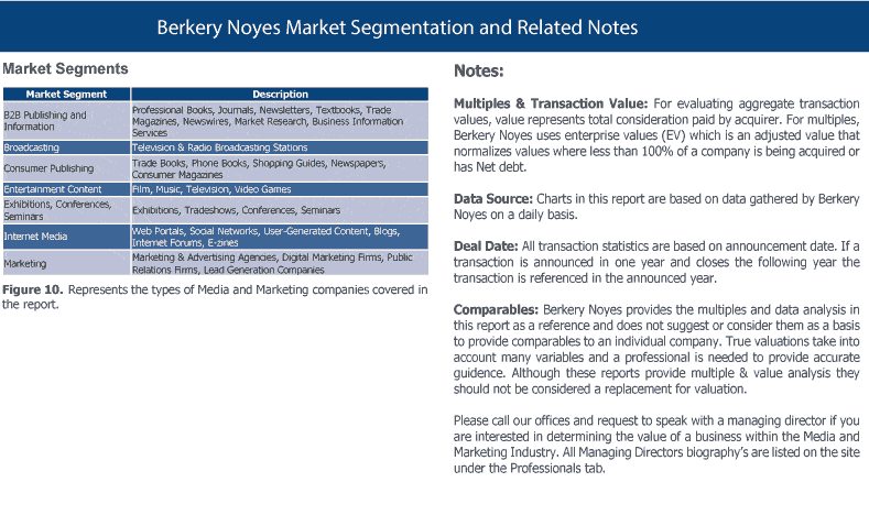 Berkery Noyes tracked 2,866 Media and Marketing transactions between 2020 and 1st Half 2022 of which 581 disclosed financial terms, and calculated the aggregate transaction value to be $377.83 billion. Based on known transaction values, we project values of 2,285 undisclosed transactions to be $48.17 billion, totaling $426 billion worth of transactions tracked over the past two and a half years.