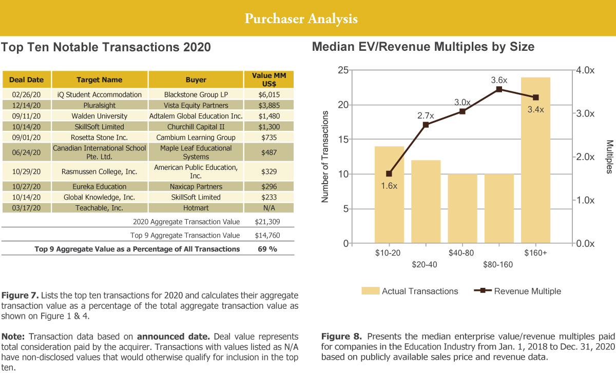 Along these lines were Vista Equity Partners’ announced acquisition of Pluralsight, a technology learning platform for software developers, IT administrators, and creative professionals, for $3.89 billion; Churchill Capital Corp II’s announced merger with Skillsoft, which provides cloud-based corporate learning content, for $1.3 billion (following the closing of the merger, the combined company will acquire Global Knowledge for $233 million); and Cambium Learning Group’s announced acquisition of Rosetta Stone, a technology-based learning solutions company best known for its language programs, for $735 million.