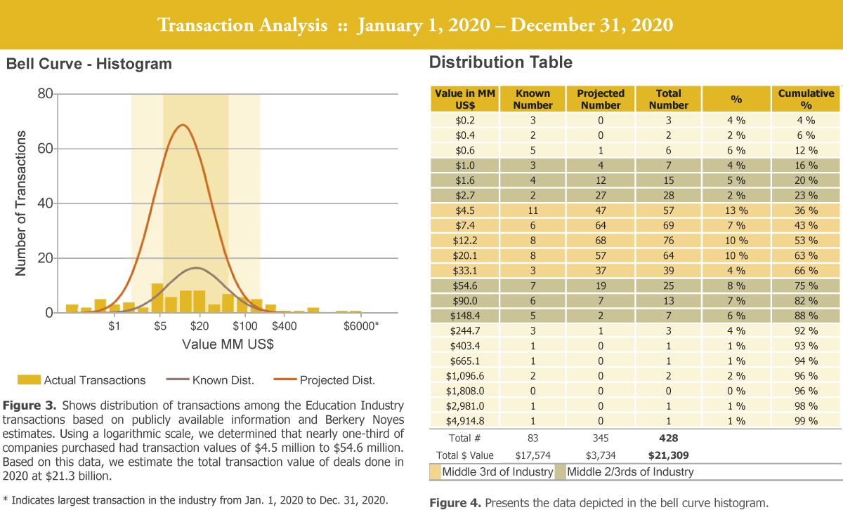 Berkery Noyes tracked 1,349 Education transactions between 2018 and 2020, of which 252 disclosed financial terms, and calculated the aggregate value to be $38.44 billion. Based on known transaction values, we project values of 1,097 undisclosed transactions to be $12.04 billion, totaling $50.48 billion worth of transactions tracked over the past three years.