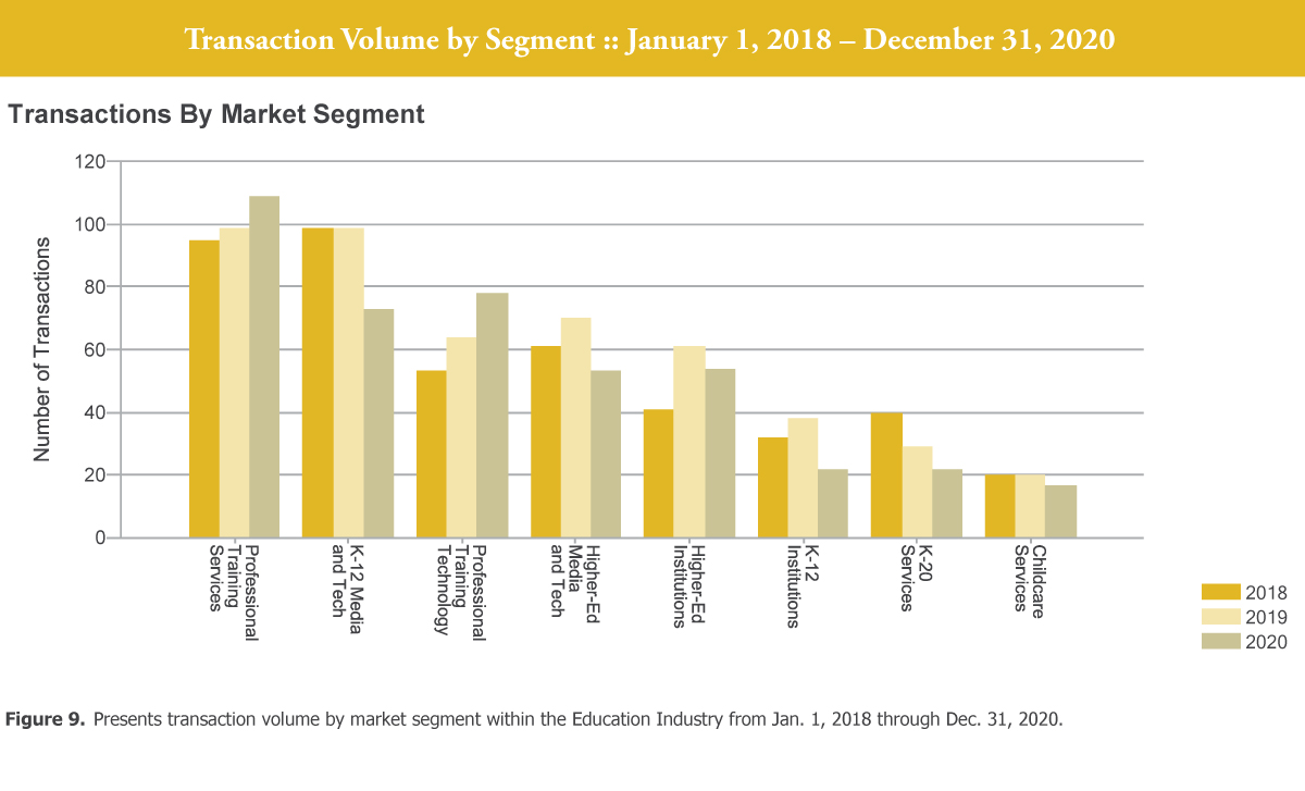 Professional Training Services, which saw volume increase ten percent on a yearly basis, surpassed K-12 Media and Tech as the industry’s most active segment in 2020.