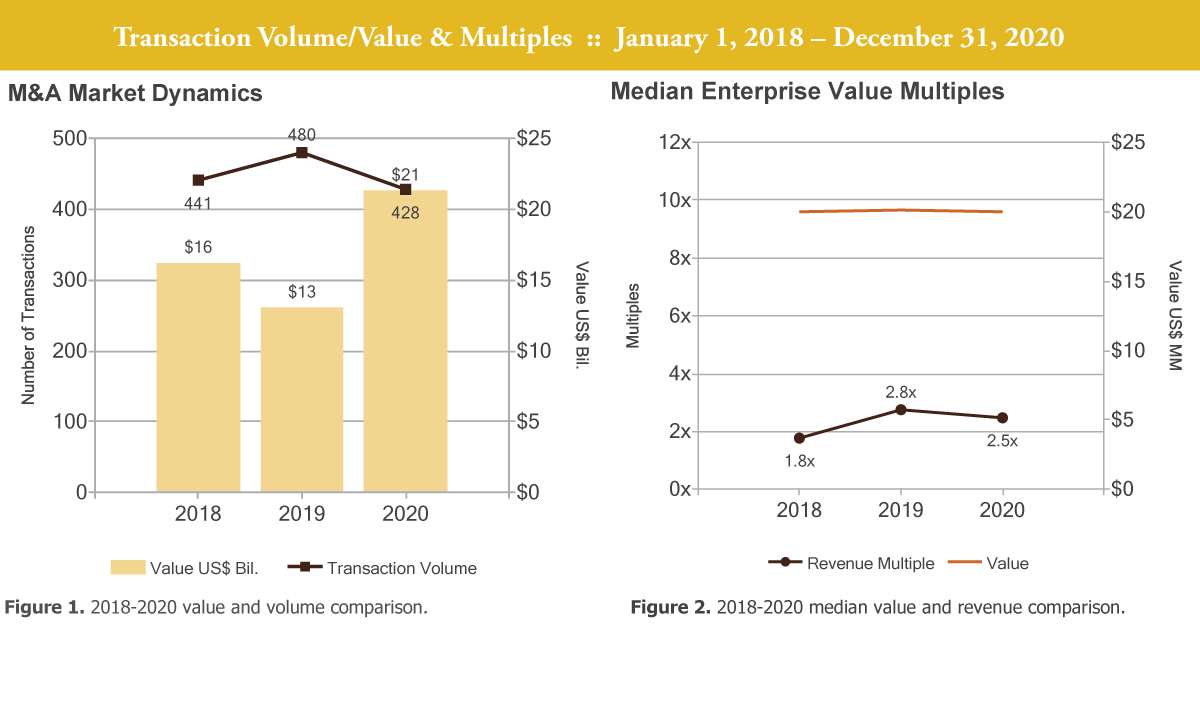 Total transaction volume in 2020 declined by 11 percent over 2019, from 480 to 428. On a half year basis, M&A activity improved five percent in 2nd Half 2020 over 1st Half 2020, from 209 to 219.