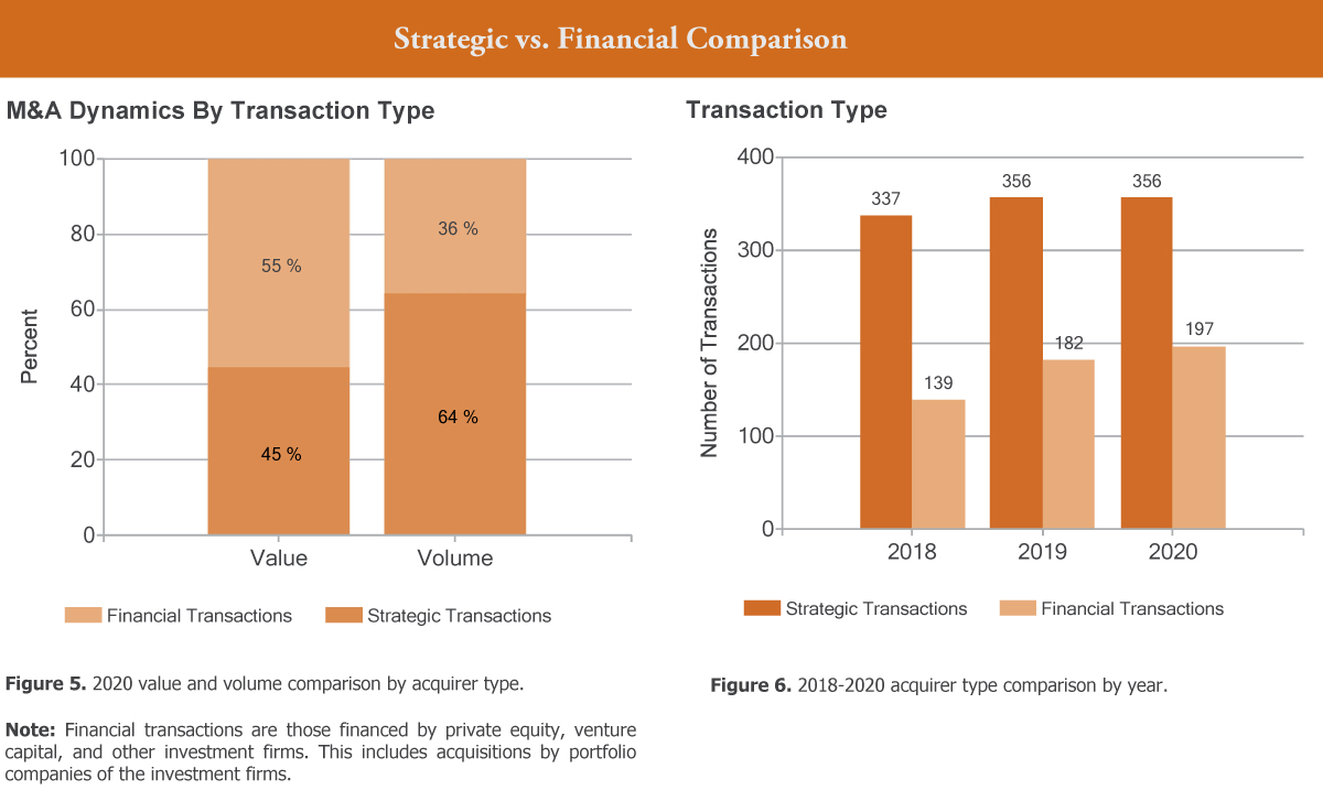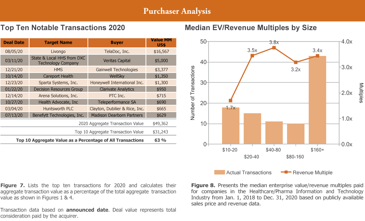 The most active acquirer in 2020 either directly or through an affiliated business was New Mountain Capital with ten industry transactions: PatientBlox, Healthcomp, Elysia Group, Laiya Consulting, FlexTech, Medal, Inc., Discern Health, SwervePay, Symplur, and 21GRAMS NY.