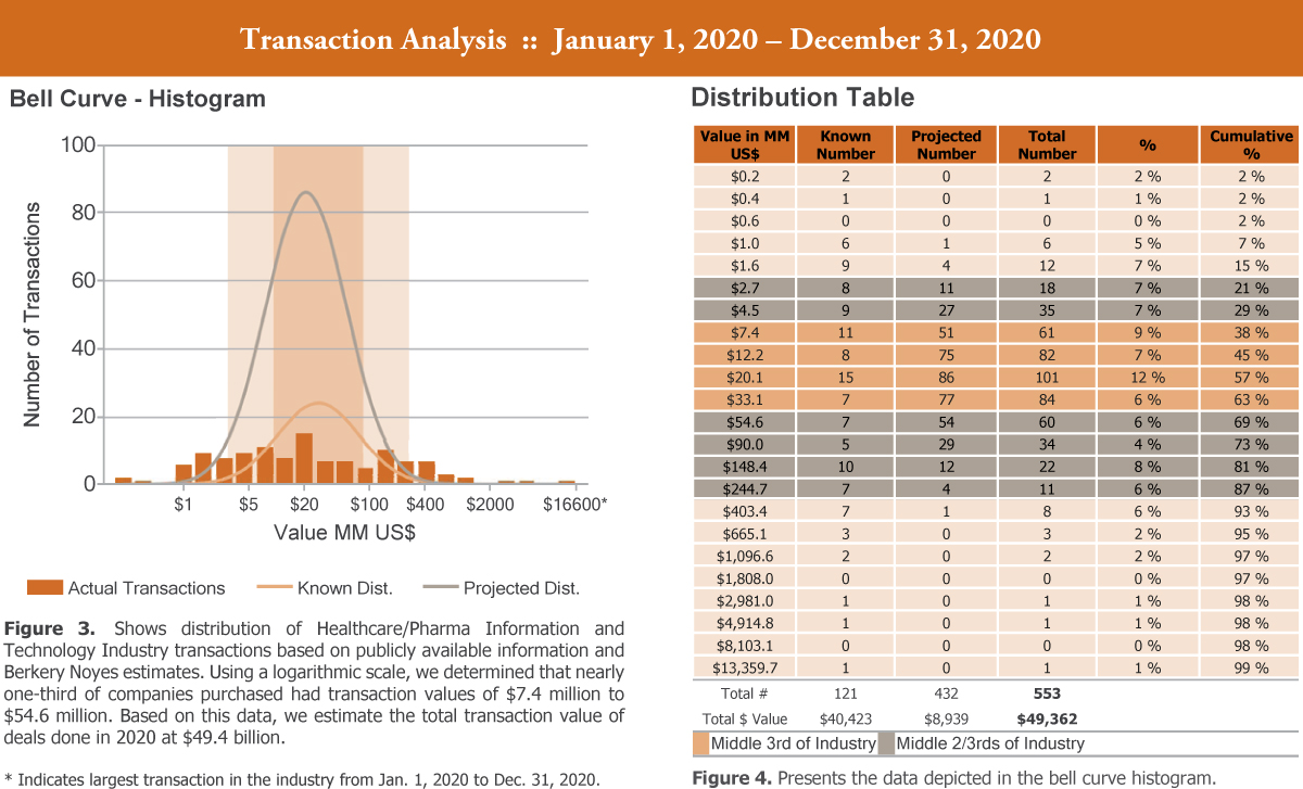 Berkery Noyes tracked 1,567 Healthcare/Pharma Information and Technology transaction between 2018 and 2020, of which 318 disclosed financial terms, and calculated the aggregate value to be $101.06 billion. Based on known transaction values, we project values of 1,249 undisclosed transactions to be $20.68 billion, totaling $121.75 billion worth of transactions tracked over the past three years.