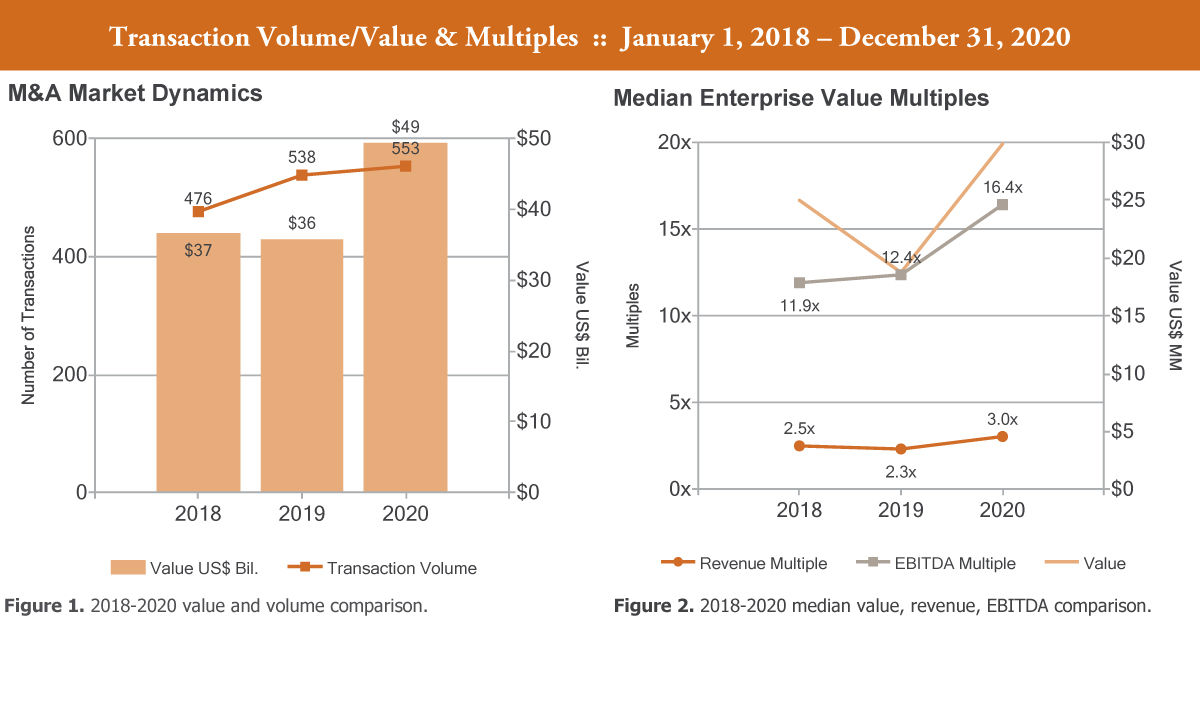 The median revenue multiple increased from 2.3x in 2019 to 3.0x in 2020. The median EBITDA multiple rose from 12.4x to 16.4x during this timeframe.