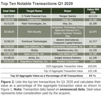 The industry’s top three largest deals in Q1 2020 each occurred in the finance vertical. Along these lines were Morgan Stanley’s announced acquisition of E-Trade, an online brokerage company, for $13.1 billion; Intuit’s announced acquisition of Credit Karma, a personal finance company that offers free credit reports, scores, and insights, for $7.1 billion; and Visa’s announced acquisition of Plaid Technologies, which develops and creates API’s for banking data, for $5.3 billion. These three transactions, with a combined value of $25.5 billion, accounted for 46 percent of total industry value year-to-date.
