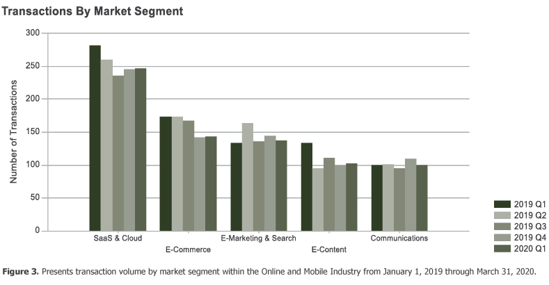 As for specific industry markets, deal flow remained about constant in the SaaS & Cloud, E-Commerce, and E-Content segments on a quarterly basis. E-Marketing & Search volume decreased four percent, returning to its Q4 2019 level. The number of transactions in the Communications segment, after rising 13 percent in Q4 2019, declined eight percent.