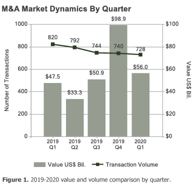 Rounding out the top five largest deals in Q1 2020 were two transactions in the security sector: a Symphony Technology Group led consortium’s announced acquisition of Dell Technologies’ RSA Security business for $2.1 billion; and Advent International and Crosspoint Capital Partners’ announced acquisition of ForeScout Technologies, which develops device visibility, control, and cybersecurity solutions, for $1.7 billion.
