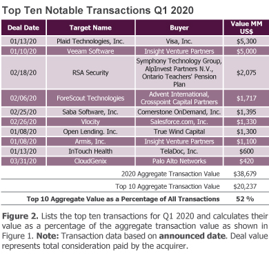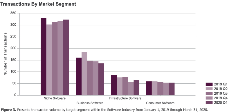 Deal volume in the “Niche Software” segment, which is targeted to specific vertical markets, improved two percent over Q4 2019. This was the sector’s third consecutive quarterly rise in deal flow. Three of the industry’s top ten largest transactions took place in the segment, including two in the Finance vertical: Visa’s announced acquisition of Plaid Technologies, which develops and creates API’s for banking data, for $5.3 billion; and True Wind Capital’s announced acquisition of Open Lending, which delivers lending enablement and risk analytics solutions to financial institutions, for $1.3 billion.