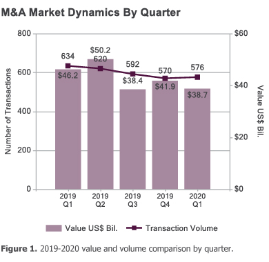 The Infrastructure segment experienced a 14 percent volume increase on a quarterly basis, making it the highest growth sector in Q1 2020. In terms of value, three of the industry’s top five largest deals year-to-date occurred in the segment. Along these lines were Insight Venture Partners’ acquisition of Veeam Software, a cloud-focused backup and disaster recovery services provider, for $5 billion; a Symphony Technology Group led consortium’s announced acquisition of Dell Technologies’ RSA Security business for $2.1 billion; and Advent International and Crosspoint Capital Partners’ announced acquisition of ForeScout Technologies, which develops device visibility, control, and cybersecurity solutions, for $1.7 billion.