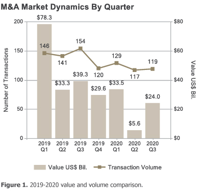 These four transactions, with an aggregate value of $19.5 billion, represented 31 percent of transaction value in the 1st 3 Quarters of 2020 and 81 percent of Q3 2020 transaction value.