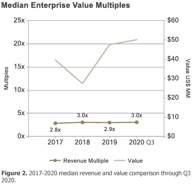 The median revenue multiple from 2019 through the 1st 3 Quarters of 2020 shifted slightly, from 2.9x to 3.0x.