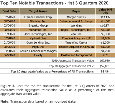 Two of the top three highest value deals in Q3 2020 involved SaaS-based companies that serve the mortgage sector: Intercontinental Exchange’s announced acquisition of Ellie Mae for $11 billion; and Black Knight’s announced acquisition of Optimal Blue for $1.8 billion, which it plans to merge with its Compass Analytics business in a newly formed entity.