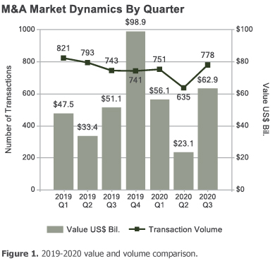 These five transactions, with an aggregate value of $31.3 billion, represented 22 percent of transaction value in the 1st 3 Quarters of 2020 and 50 percent of Q3 2020 transaction value.