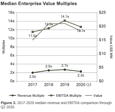 The median revenue multiple from 2019 through the 1st 3 Quarters of 2020 declined by 15 percent, from 2.7x to 2.3x.