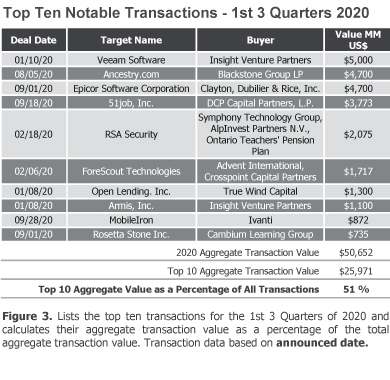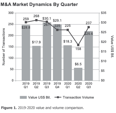 These five transactions, with an aggregate value of $14.8 billion, represented 29 percent of transaction value in the 1st 3 Quarters of 2020 and 58 percent of Q3 2020 transaction value.