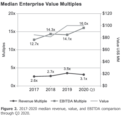Disclosed median enterprise value multiples from 2017 through the 1st 3 Quarters of 2020 were 3.0x revenue and 14.4x EBITDA.