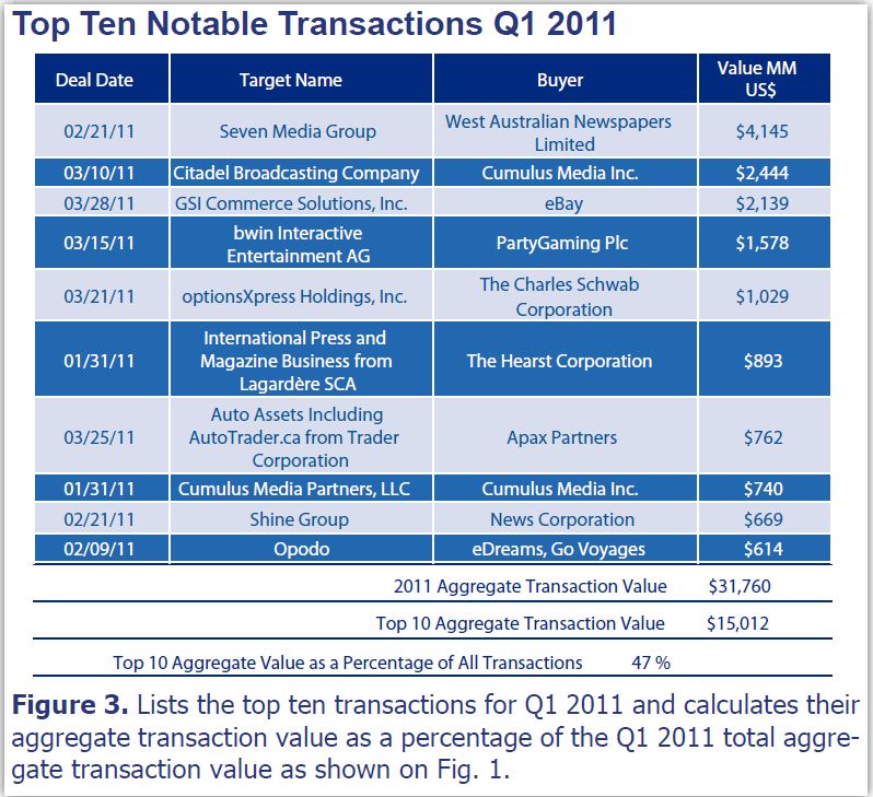 West Australian Newspapers Limited purchase of Seven Media Group was the largest transaction by value in Q1 2011 at $4.14 billion. This transaction alone represented 12 percent of the aggregate transaction value of the quarter.