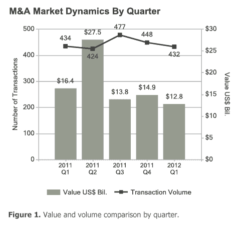 After an especially strong second half in 2011, Online and Mobile transaction volume declined four percent in Q1 2012. Deal value decreased 14 percent to $12.8 billion.
