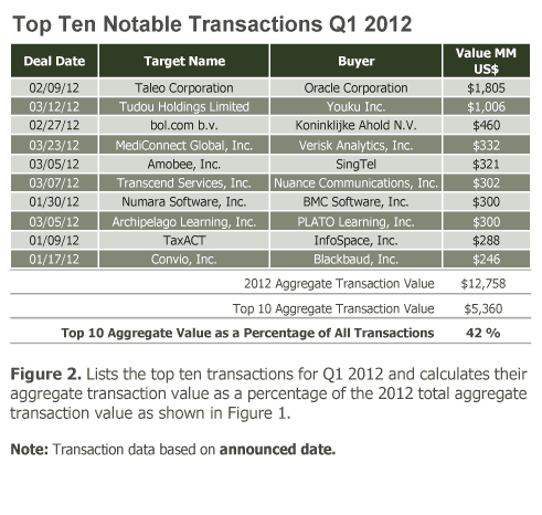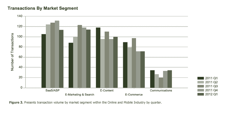 The Digital Marketing component of E-Marketing and Search underwent a seven percent increase in Q1 2012. This also represented a 46 percent increase relative to Q1 2011. Mobile advertising companies were involved in several of these M&A deals. For instance, Amobee’s announced acquisition by Singapore Telecommunications (SingTel) for $321 million was the largest Digital Marketing transaction in Q1 2012.