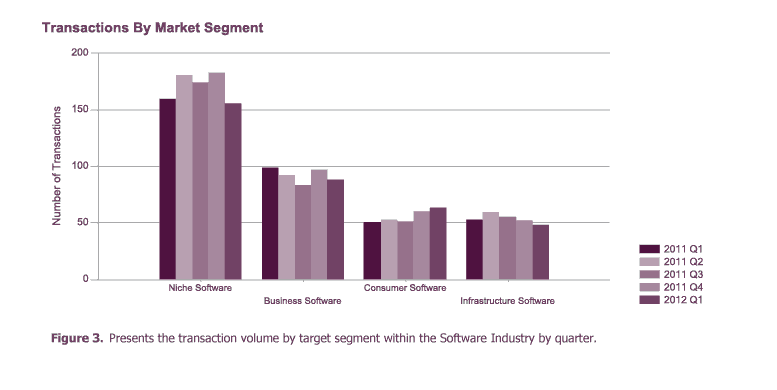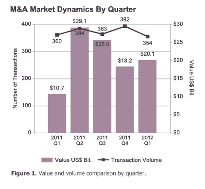 Q1 2012 transaction volume in the Software Industry declined 10 percent compared to the previous quarter, returning closer to the quarterly average for 2011, which was 375 transactions.