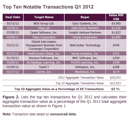 Niche Software, which is targeted to specific vertical industries, remained the largest market segment tracked by Berkery Noyes. Although deal volume for Niche Software decreased 15 percent following Q4 2011, the segment’s deal value nearly doubled, rising from $6.1 billion to $11.0 billion. Two of the top ten deals in the aggregate software industry for Q1 2012, Cisco Systems’ announced acquisition of NDS Group for $5 billion and Vista Equity Partners’ announced acquisition of Misys for $2 billion, accounted for this significant rise in value.