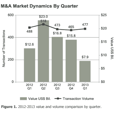 The Online & Mobile Industry experienced a three percent increase in transaction volume over the past three months. Deal value declined 50 percent between Q4 2012 and Q1 2013, from $15.8 billion to $7.9 billion.