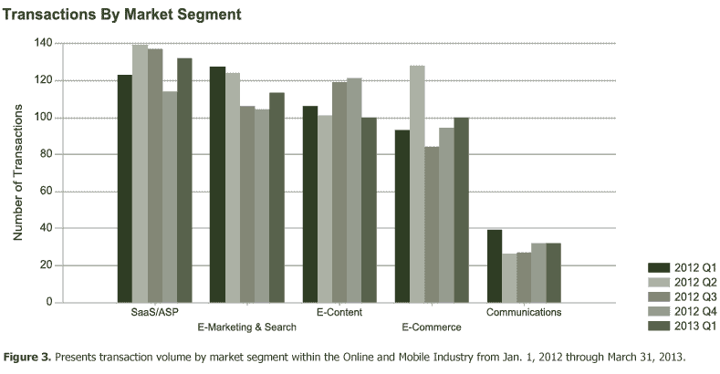 Google’s acquisition of Channel Intelligence for $125 million was the largest E-Commerce transaction in Q1 2013. E-Commerce experienced a six percent volume increase during the past quarter. Aside from Q2 2012, which saw a 38 percent rise in volume, this was the segment’s strongest level of activity over the last 15 months.