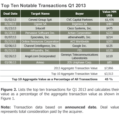 Deal volume in the E-Marketing & Search segment, after remaining nearly constant during the prior two quarters, increased nine percent in Q1 2013. Along these lines, Twitter acquired BlueFin Labs, a social television analytics company, while Facebook acquired Atlas, an ad serving platform.