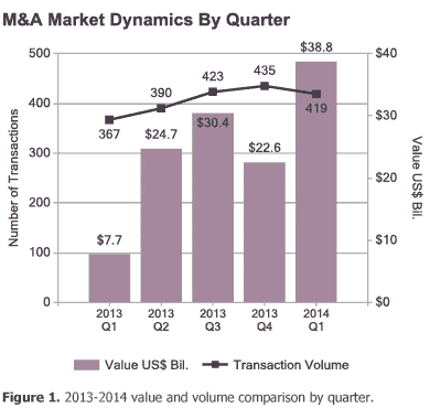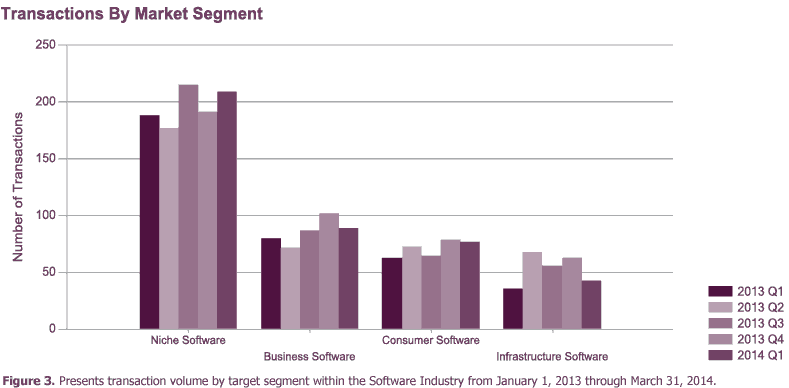 The Niche Software segment, which consists of software that is targeted to specific vertical markets, underwent a ten percent volume increase in Q1 2014. In terms of growth areas within the segment, deal volume pertaining to the Healthcare IT market increased 31 percent. Meanwhile, the largest Niche Software transaction during Q1 2014 was Thoma Bravo’s acquisition of Travelclick, which provides cloud-based hotel management software, for $930 million.