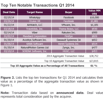 Software transaction volume declined four percent over the past three months, from 435 to 419. However, this represented a 14 percent increase compared to Q1 2013. Deal value gained 72 percent, from $22.6 billion in Q4 2013 to $38.8 billion in Q1 2014. This rise in aggregate value was attributable in large part to Facebook’s acquisition of Whatsapp, a cross-platform mobile messaging application, for $16 billion. The top ten largest transactions accounted for 61 percent of the industry’s total value in Q1 2014, compared to 55 percent in Q4 2013 and 38 percent Q1 2013.