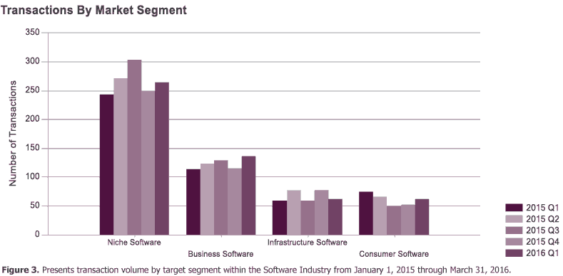 Deal volume in the Niche Software segment, which is targeted to specific vertical markets, increased six percent on a quarterly basis. Eight of the industry’s top ten highest value acquisitions thus far in 2016 occurred in the Niche segment. Of note, three of these eight transactions were located in the Healthcare vertical. The largest Healthcare related deal year-to-date was GI Partners’ announced acquisition of Netsmart Technologies, a provider of electronic health records, patient management, billing and other solutions, for $950 million. Netsmart is being acquired in a joint venture with Allscripts.