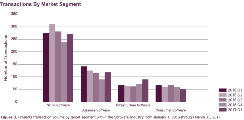 As for other industry sectors, volume in the Niche Software segment, which is targeted to specific vertical markets, improved 14 percent in Q1 2017. Four of the industry’s top ten largest acquisitions thus far in 2017 occurred in the Niche segment. Meanwhile, deal activity in the Consumer Software segment declined 11 percent.